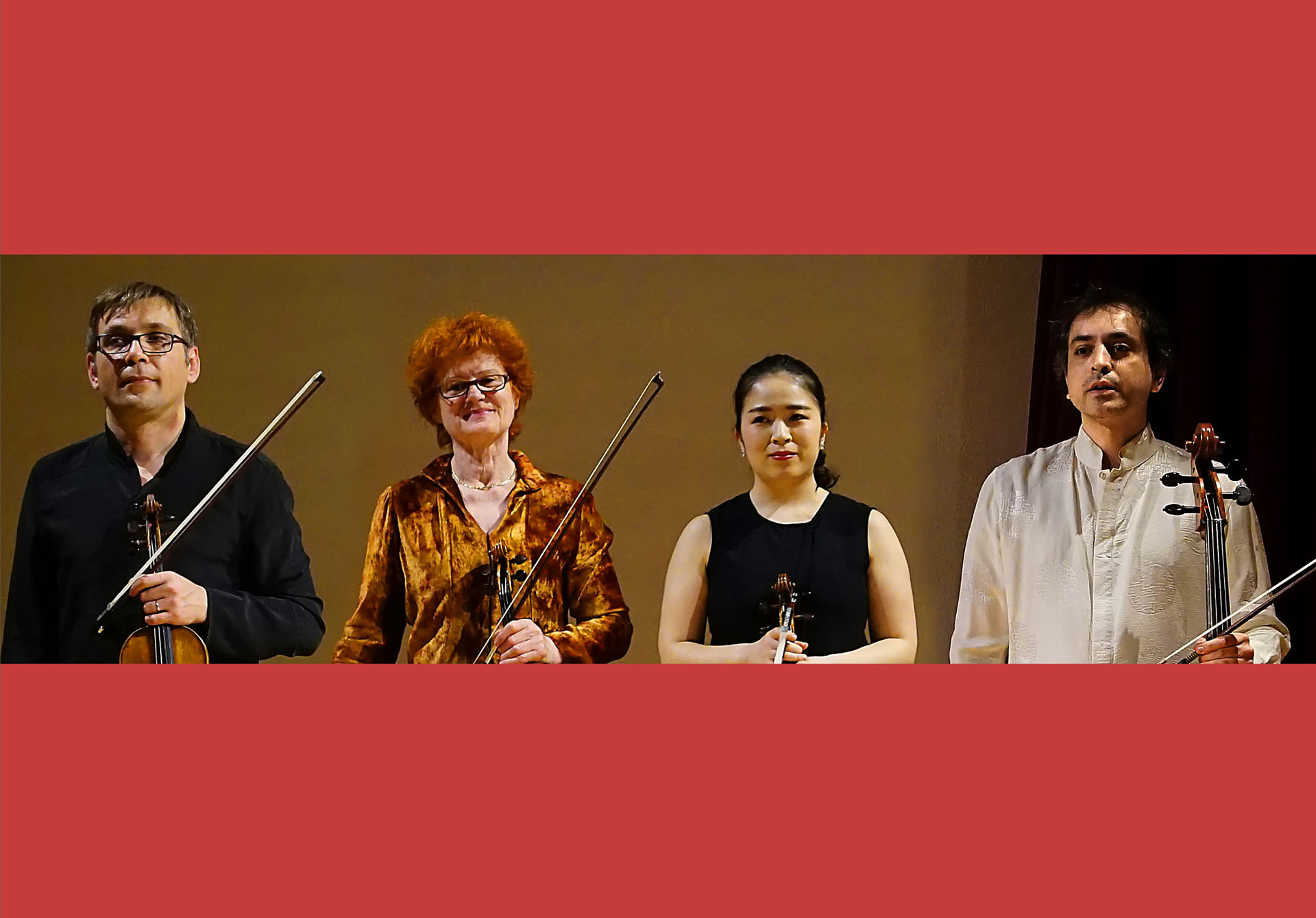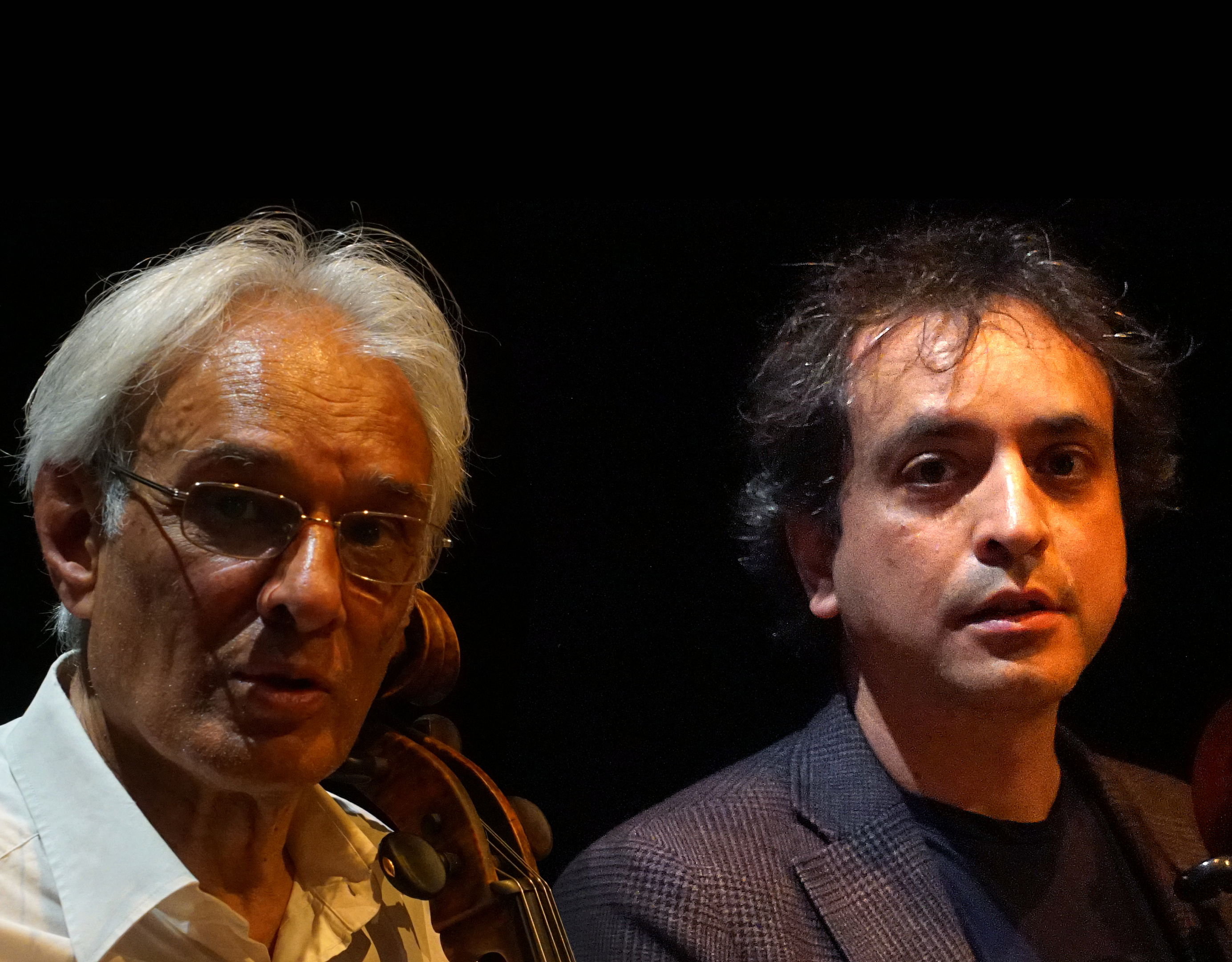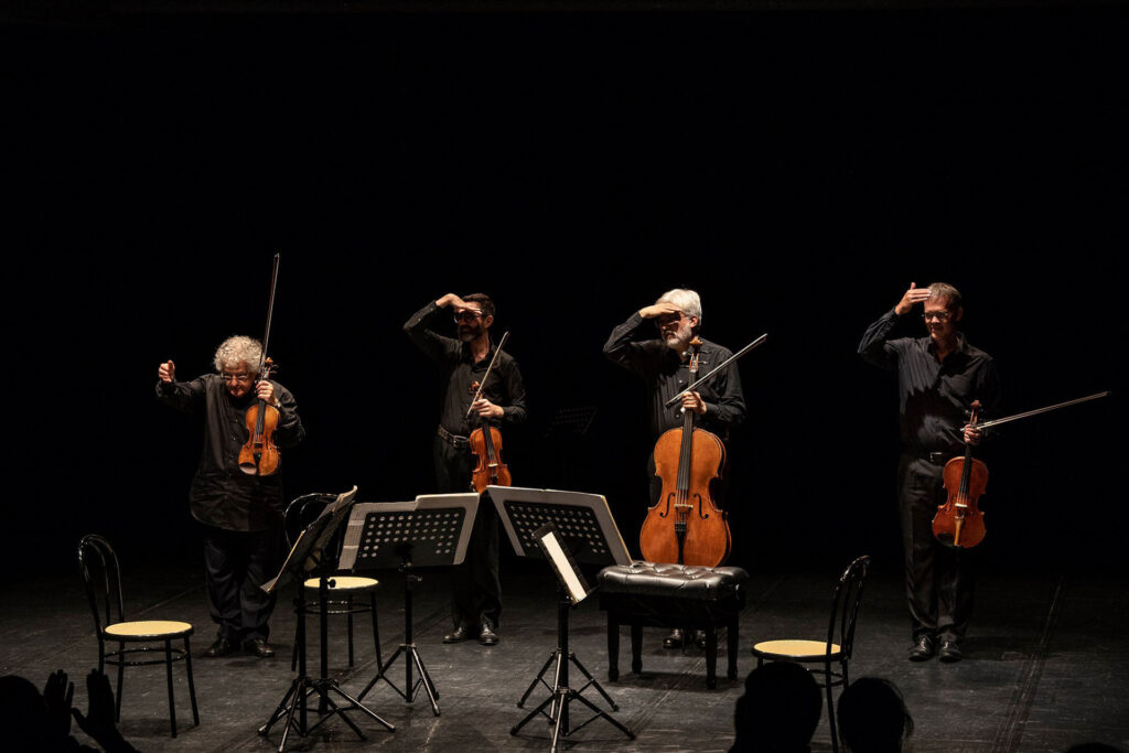 Il Quartetto Arditti cerca il compositore Helmut Lachenmann al termine del concerto “Musica come magia infranta”. 16 ottobre 2020, Teatro Vittoria, Torino
